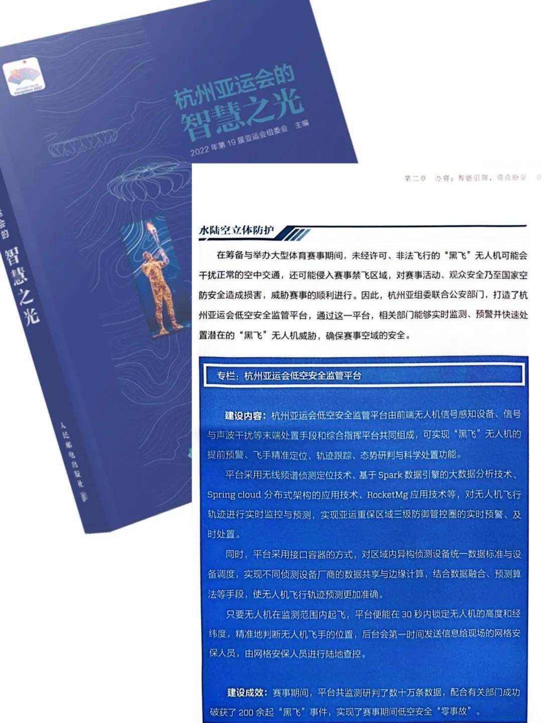 書中專欄介紹了杭州亞運會低空安全監(jiān)管平臺,該平臺由杰能科世配合有關(guān)部門研發(fā),在火種采集、火炬?zhèn)鬟f、開閉幕式、賽事場館及周邊上空織出一張隱形防護網(wǎng),最終兌現(xiàn)“零事故”的承諾,用硬核科技實力為這場國際盛會的平安圓滿保駕護航。